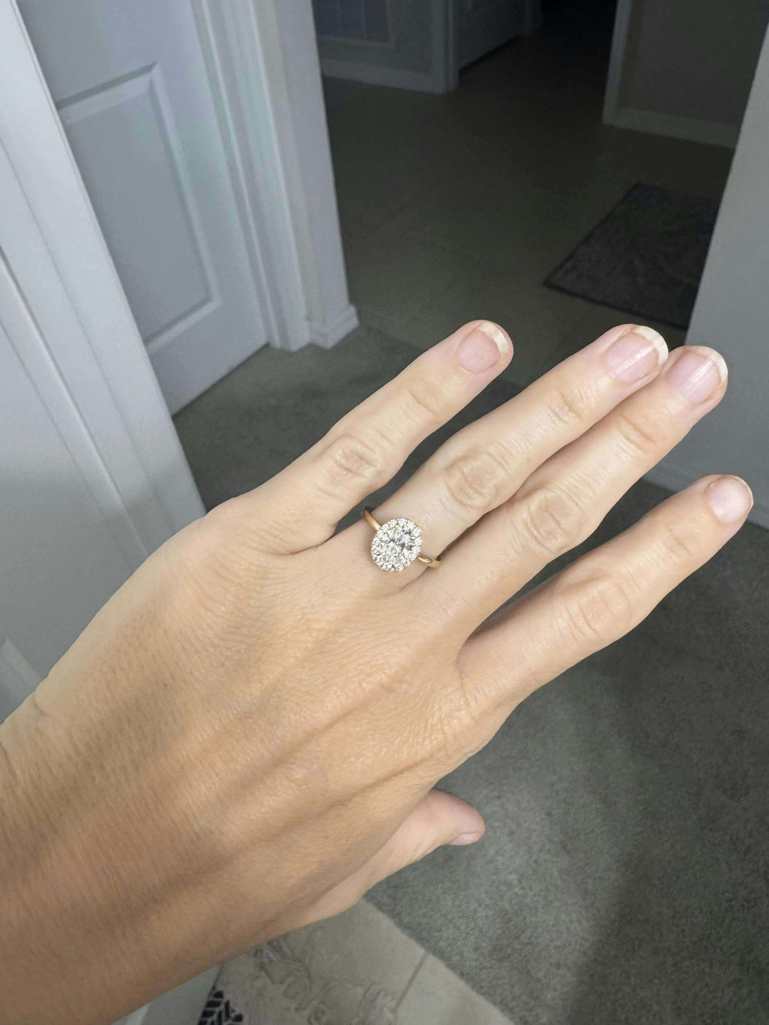 A simple and dainty oval diamond halo featuring four prongs and scalloped pavé diamonds that adorn a thin halo on a 1.7mm width band that is durable enough for everyday wear yet beautifully delicate.