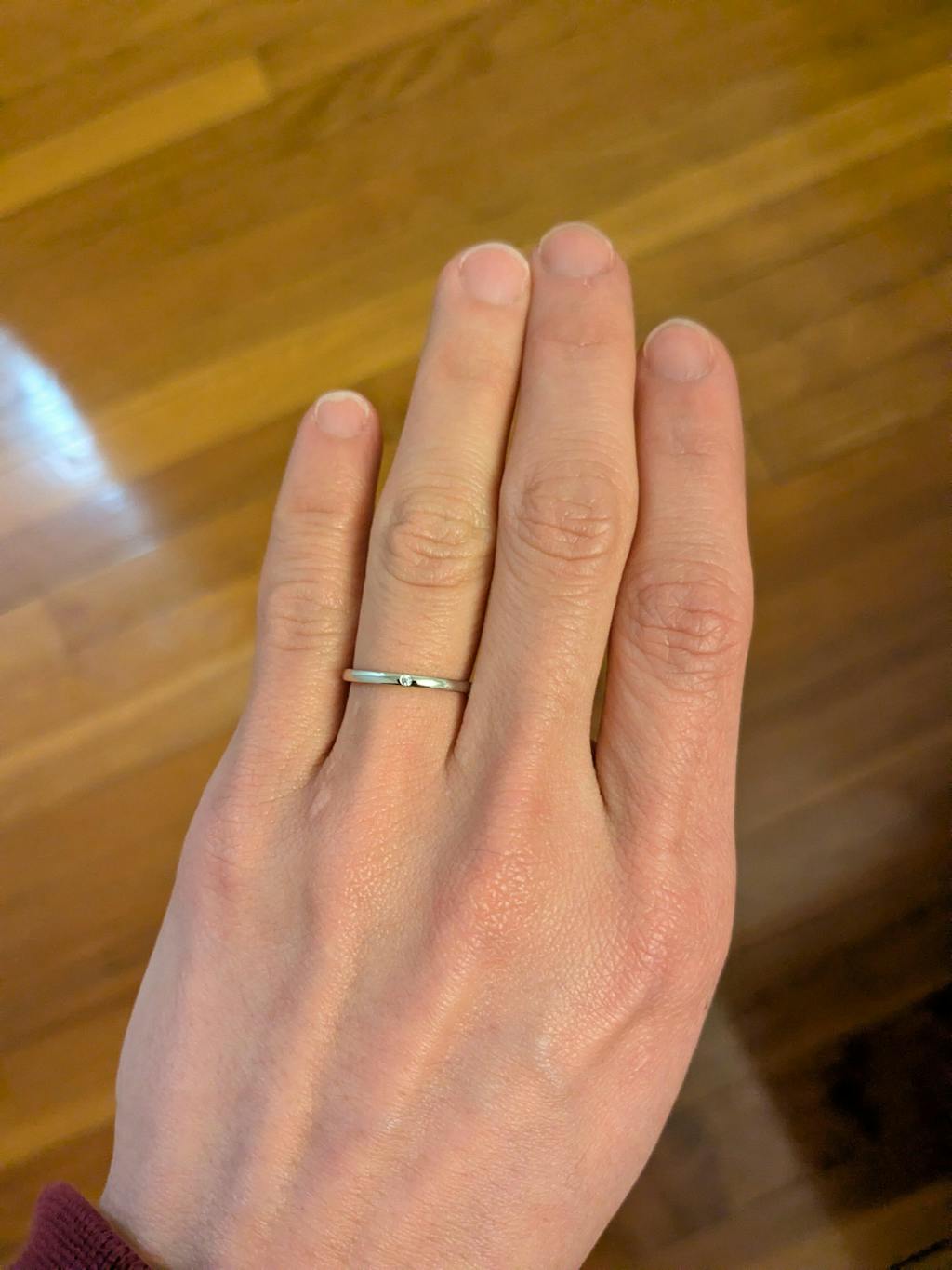 I like this simple, thin band with a small stone. The diamond is smaller than I'd imagined, but it's perfect for my size 4 finger and pairs beautifully with my engagement ring without competing for attention. Perfect for daily wear!
