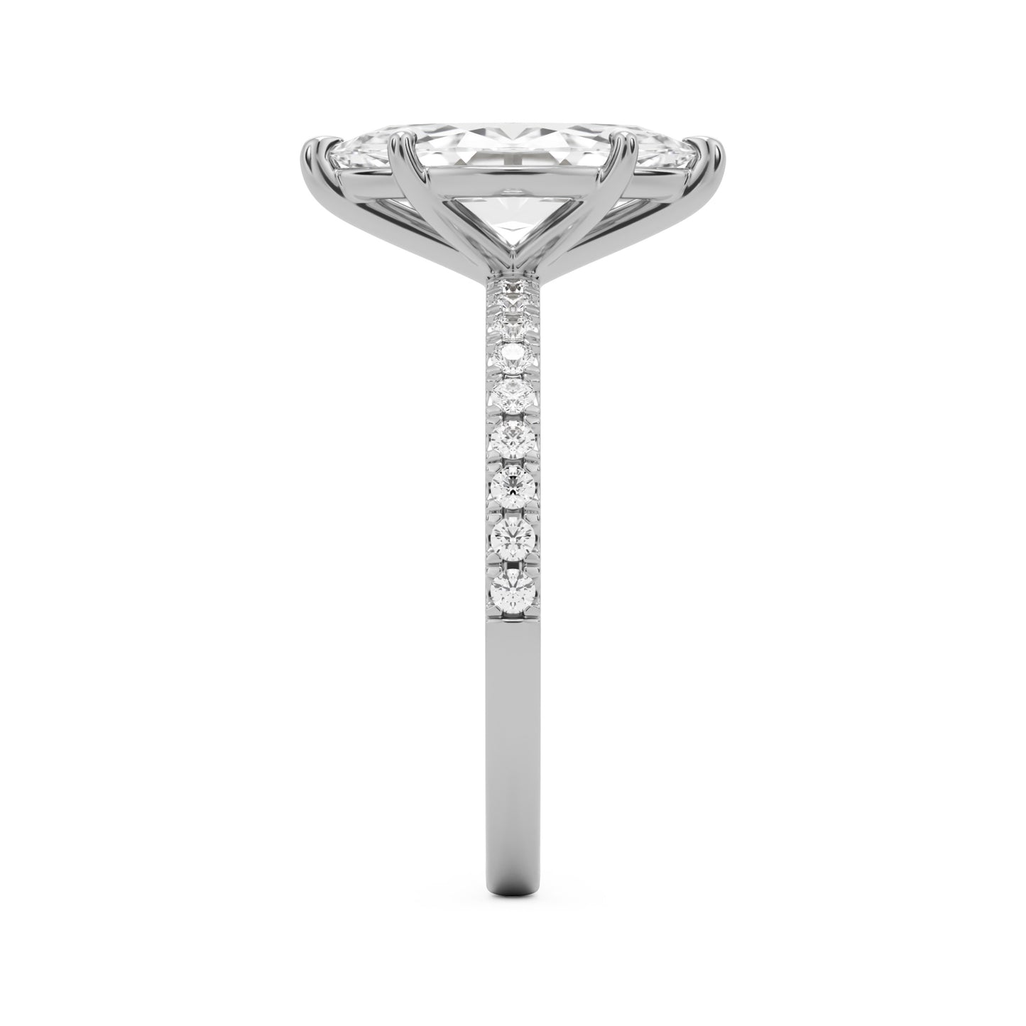 A simple and dainty marquise solitaire featuring six prongs and scalloped pavé diamonds that adorn a thin 1.7mm band that is durable enough for everyday wear yet beautifully delicate.