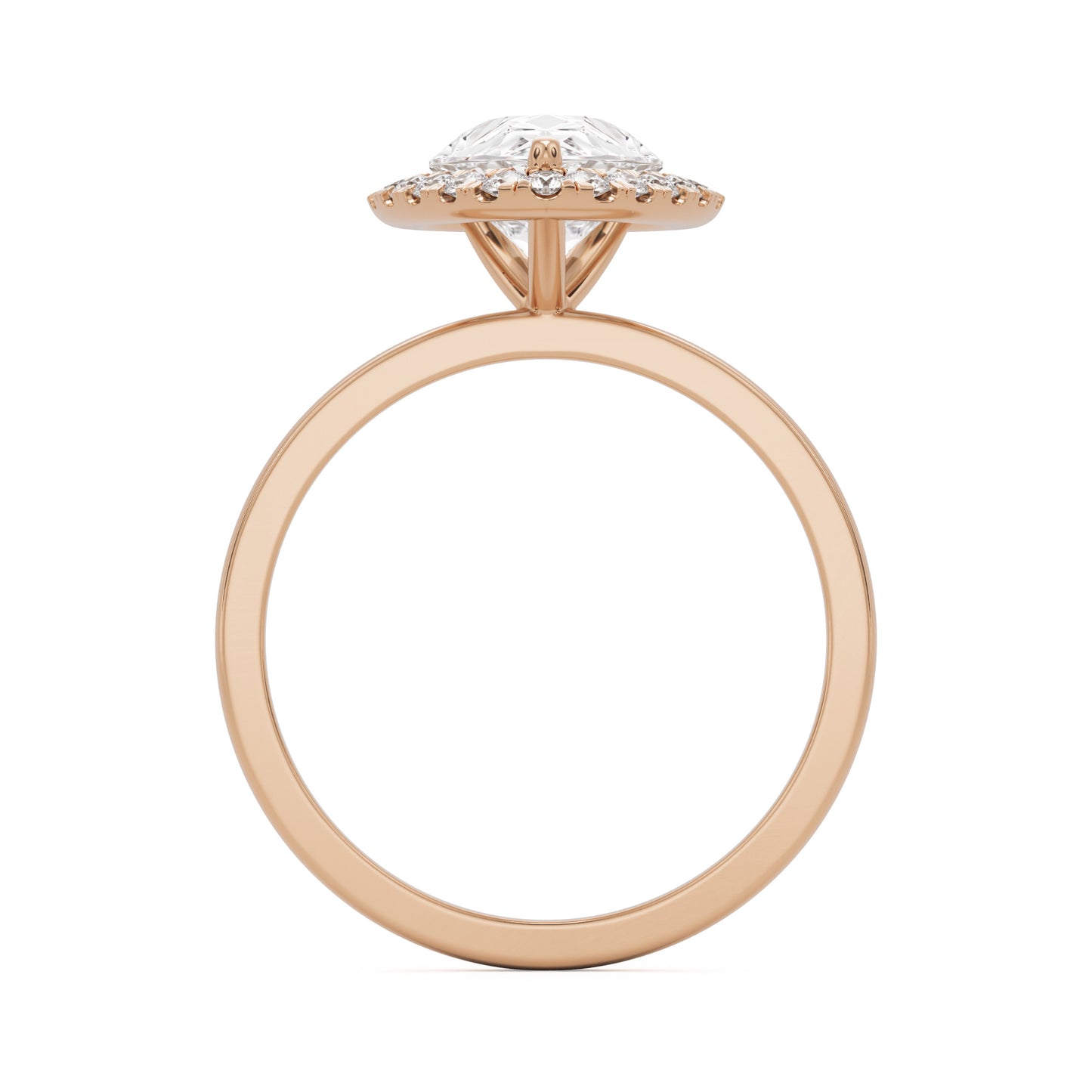 A simple and dainty Pear diamond in halo featuring three prongs and scalloped pavé diamonds that adorn the halo over a thin 1.7mm plain band that is durable enough for everyday wear yet beautifully delicate.